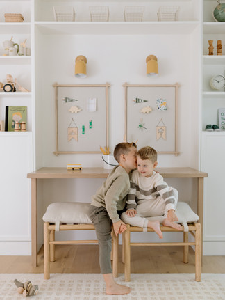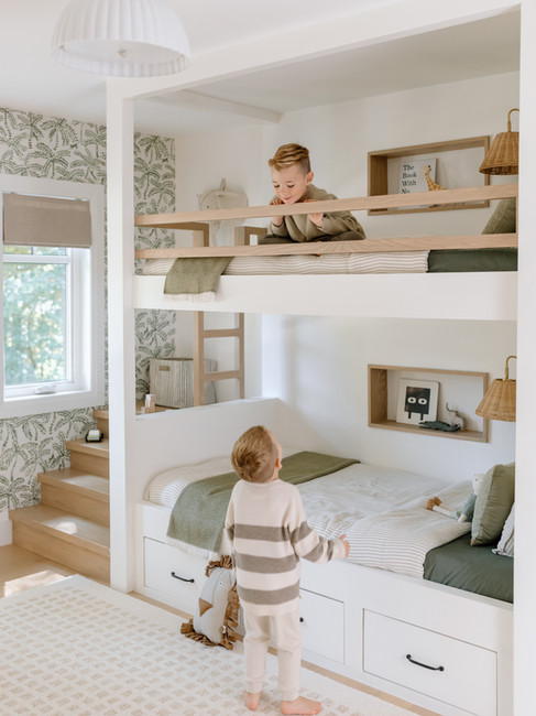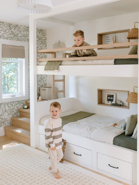 I've been waiting for this moment since Liam (my 2nd) was born. That my boys would one day share a room with bunk beds! The room is quite large with a wall full of windows making it difficult to do standard bunk beds tucked into a corner. So we strategically came up with a layout that would not block off any natural light. The stairs by the windows helped create separation but there was still a blank wall by the closet. I wanted it to stay open and light so we created these pass through shelves. I'm so happy with how it all turned out! The wallpaper added a playful touch while still keeping the room neutral as well as the ability to mature with the room. I wanted to create storage for their toys that was Montessori inspired and learning themed instead of too colourful and "loud" toys which could be on the main floor playroom. I wanted to promote a peaceful space meant for winding down before bed time. They have the low tables to play on the carpet, or they can pull them aside and have space to build forts. The room is a balance between everything "in place" but also space for imagination. While the bunks were being built the boys would visit everyday and I'm so glad that the excitement hasn't gone away. Saying goodnight to the boys in their bunks just completes one of my greatest dreams. Hope you enjoy the reveal!